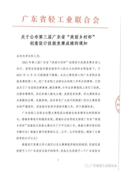 2021年广东省职业技能竞赛——第三届广东省“美丽乡村杯”创意设计技能大赛在广东省人力资源和社会保障厅、广东省职业技能鉴定服务指导中心的全力支持和全程监督下圆满落下帷幕,并于2021年12月公布结果,我校创意设计学院教师蒋海霞在民俗文化项目中摘得金牌,将被广东省人力资源和社会保障厅授予“广东省技术能手”荣誉称号。同时,创意设计学院服装设计专业学生在该项目中获得一等奖1项、二等奖1项,三等奖2项,刘梦老师获得优秀指导教师称号。