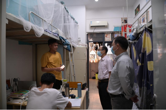 贺校长一行先后到学生宿舍、教室、学生食堂、员工临时宿舍、校园进出口等场所检查疫情防控措施落实情况,并对坚守在疫情防控一线的工作人员进行慰问,提出工作要求。在学生宿舍和教室,详细询问同学们日常生活和线上上课情况,叮嘱同学们有需求及时和老师沟通,提醒同学们做好个人防护,同时加强身体锻炼。在食堂,仔细了解食堂卫生安全管理和学生就餐情况,强调要加强环境卫生和食品安全管理,严格落实各项防疫措施,确保学生就餐环境以及餐品安全。