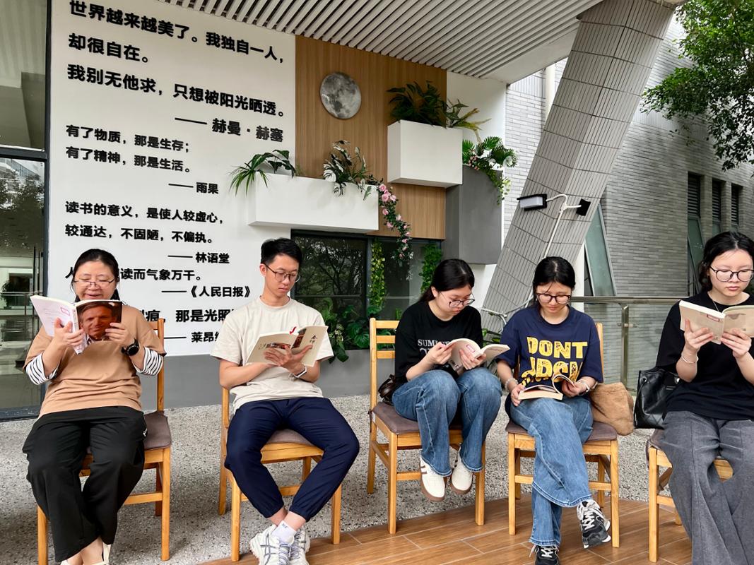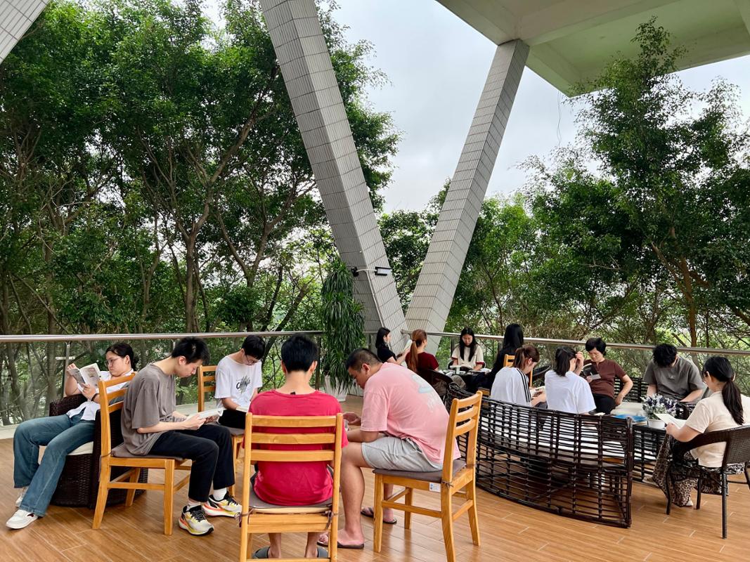 “共读半小时”活动凝聚粤港澳桂琼地区图书馆的合力,自2016年由深圳图书馆界发起,至今已连续举办十一届,成为华南地区推广全民阅读的文化品牌。我校图书馆作为东莞主会场的重要共读点之一,今年共读场地移至图书馆三楼户外悦读花园。该阅读点深受师生喜爱,春日里阳光明媚、绿意盎然,书页的墨香与草木的清香在此交融。