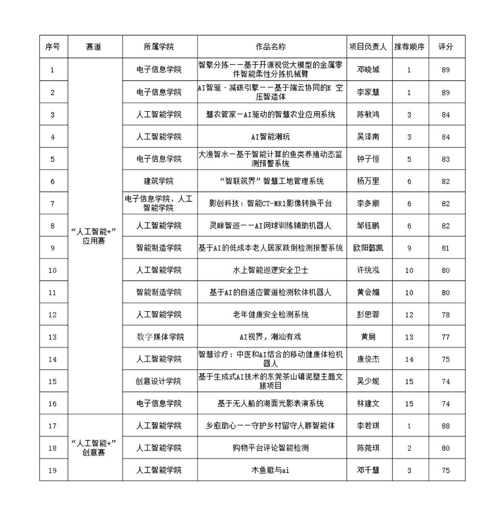 根据第十九届“挑战杯”全国大学生课外学术科技作品竞赛“人工智能+”专项赛的工作安排,通过自主申报共收到19个作品,经资格审查、专家评审后拟推荐《智擎分拣——基于开源视觉大模型的金属零件智能柔性分拣机械臂》等19个作品参加省级评选(详见附图)。