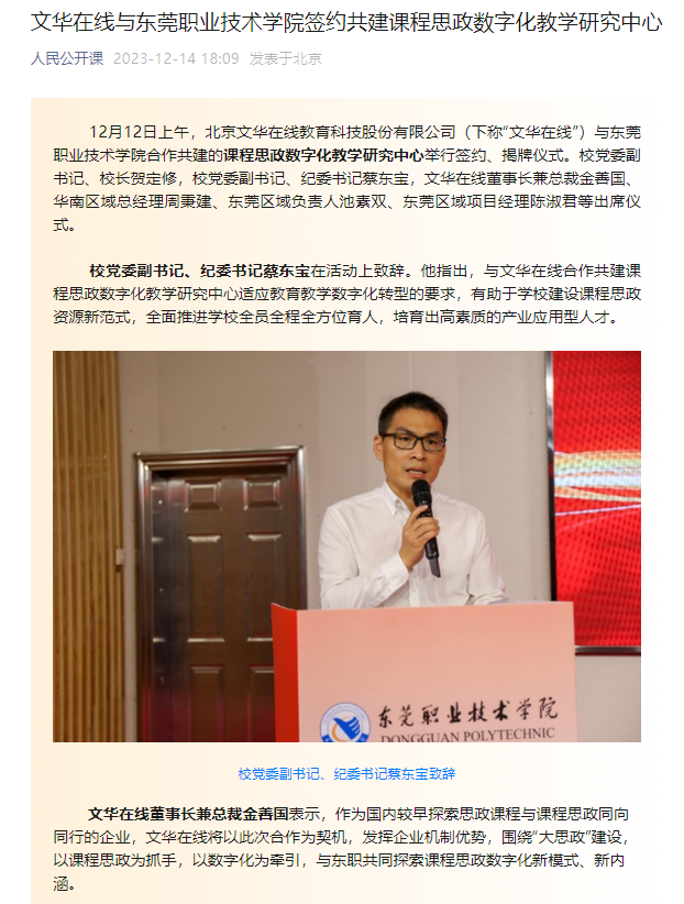 【人民公开课】文华在线与东莞职业技术学院签约共建课程思政数字化教学研究中心
